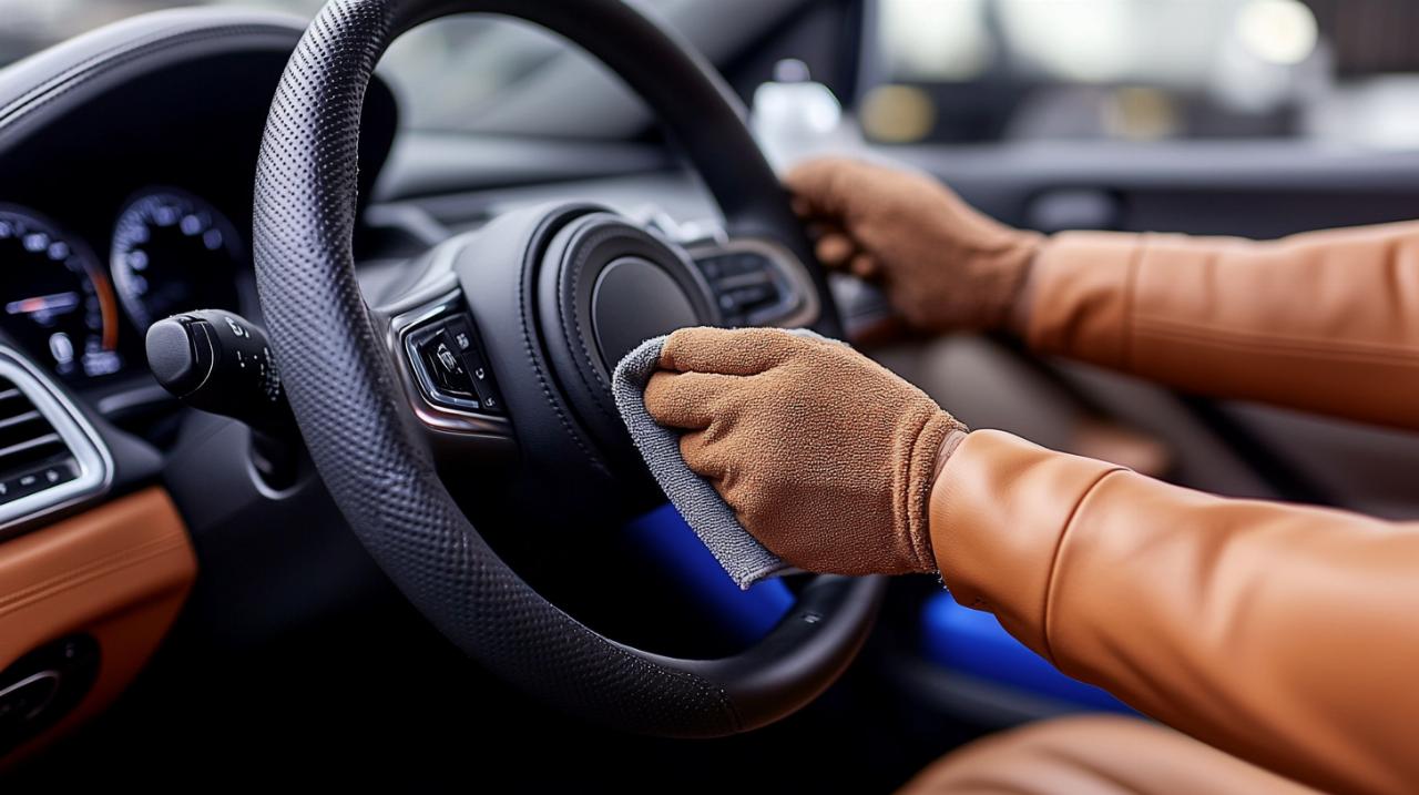La technique de nettoyage influence directement le résultat obtenu. Il est recommandé d'utiliser une brosse de nettoyage spécifique pour sellerie automobile, proposée à douze euros quatre-vingt-dix, qui permet de travailler les zones difficiles d'accès sans endommager le cuir. Appliquez le produit nettoyant sur le volant en effectuant des mouvements circulaires pour désincruster les impuretés. Laissez agir quelques instants selon les recommandations du fabricant, puis essuyez avec une chamoisine ou une serviette d'essuyage appropriée. Cette dernière, disponible à cinq euros quatre-vingt-dix, offre une capacité d'absorption optimale sans laisser de peluches. Pour un nettoyage complet et efficace, l'opération peut nécessiter entre trente et quarante-cinq minutes selon l'état initial du volant.